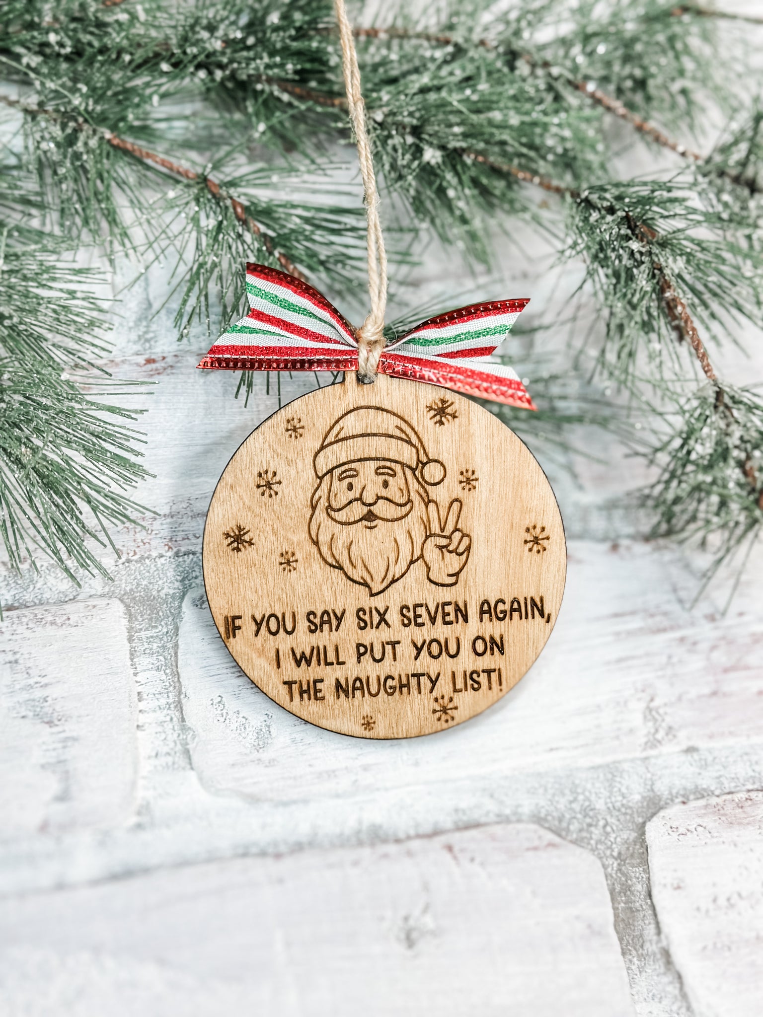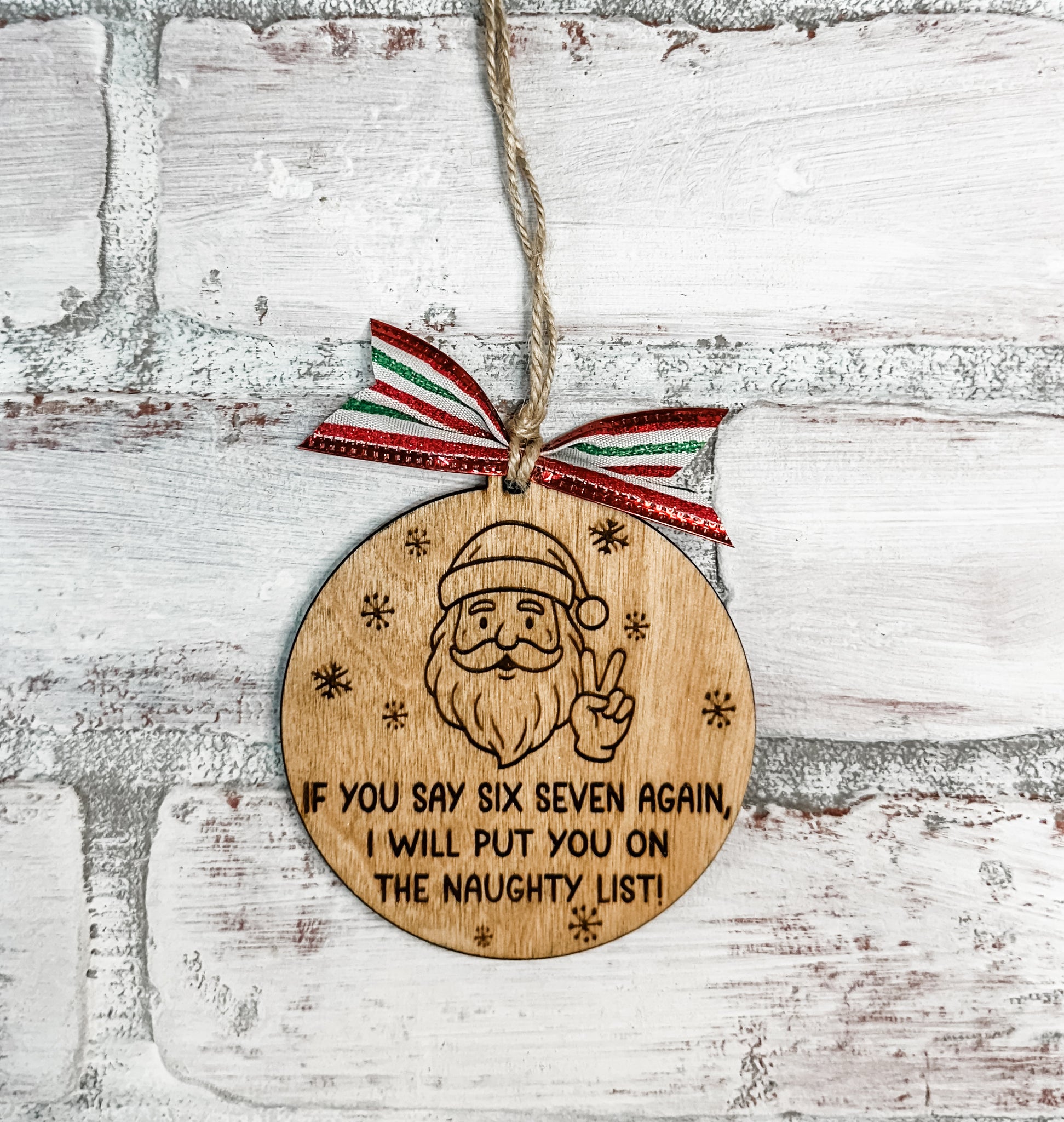 Add a touch of humor to your Christmas tree with this laser cut ornament! Let your child discover Santa's message as it hangs among the branches. Embrace the "six seven" trend with this one-of-a-kind ornament, perfect for gift exchanges!