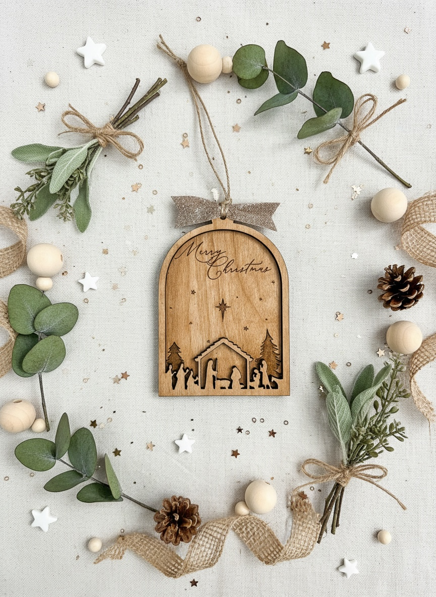 This laser-cut Christmas tree ornament makes a great gift this season! Adorned with a nativity scene and a festive "Merry Christmas" message, it's the perfect way to share the real reason for the season with loved ones.